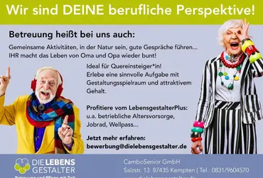 Wir sind deine berufliche Perspektive. Verstärken Sie unser Betreuungsteam. Die Lebensgestalter - Cambo Senior GmbH, ein dynamisches Unternehmen im Bereich Gesundheit und Soziale Dienste, sucht Pflegehelfer und Betreuungskräfte, die ab sofort unser Team verstärken! Bei uns steht der Mensch im Mittelpunkt, und wir legen großen Wert auf Pflege und Betreuung mit Zeit.